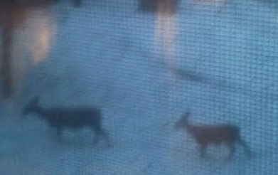 The deer look like phantoms in the snow as I steal a photo through the screen door. From December 2011 in Ruidoso, NM.