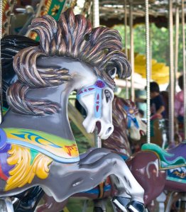 After spending time this weekend at a local festival and seeing all of the families enjoying the sights and sounds, it made me think about trips to the carnival when I was a kid. There was an annual carnival at the high school that took place either in the spring or fall, I can’t quite remember. But it was the old-school style of fair, with those rickety rides that required the purchase of a certain amount of what looked like raffle tickets. I didn’t like any of the more adventurous rides, and definitely nothing that would send me upside down. Nope, I was happiest on the good old merry-go-round or the bumper cars. When I was very small, my Dad would somehow get his long legs squished into one of the cars and help me “drive” around while I giggled as we bumped into other cars. I remember riding the carousel with Mom, holding on to the “reins” while waving to Dad, who stood nearby, cigarette dangling from his mouth.