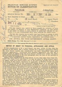 It’s interesting the pieces of a parent’s history you come across after they pass. I found Dad’s draft status card recently. Dad always claimed his flat feet (those fallen arches) kept him out of the military. I’m not sure about that, as the code on his card, 5A, means, “Registrant who is over either the age of liability (26) or (where applicable) the previous deferment age of liability (35).” The card is dated April 11, 1958, a day after Dad would have turned 26.