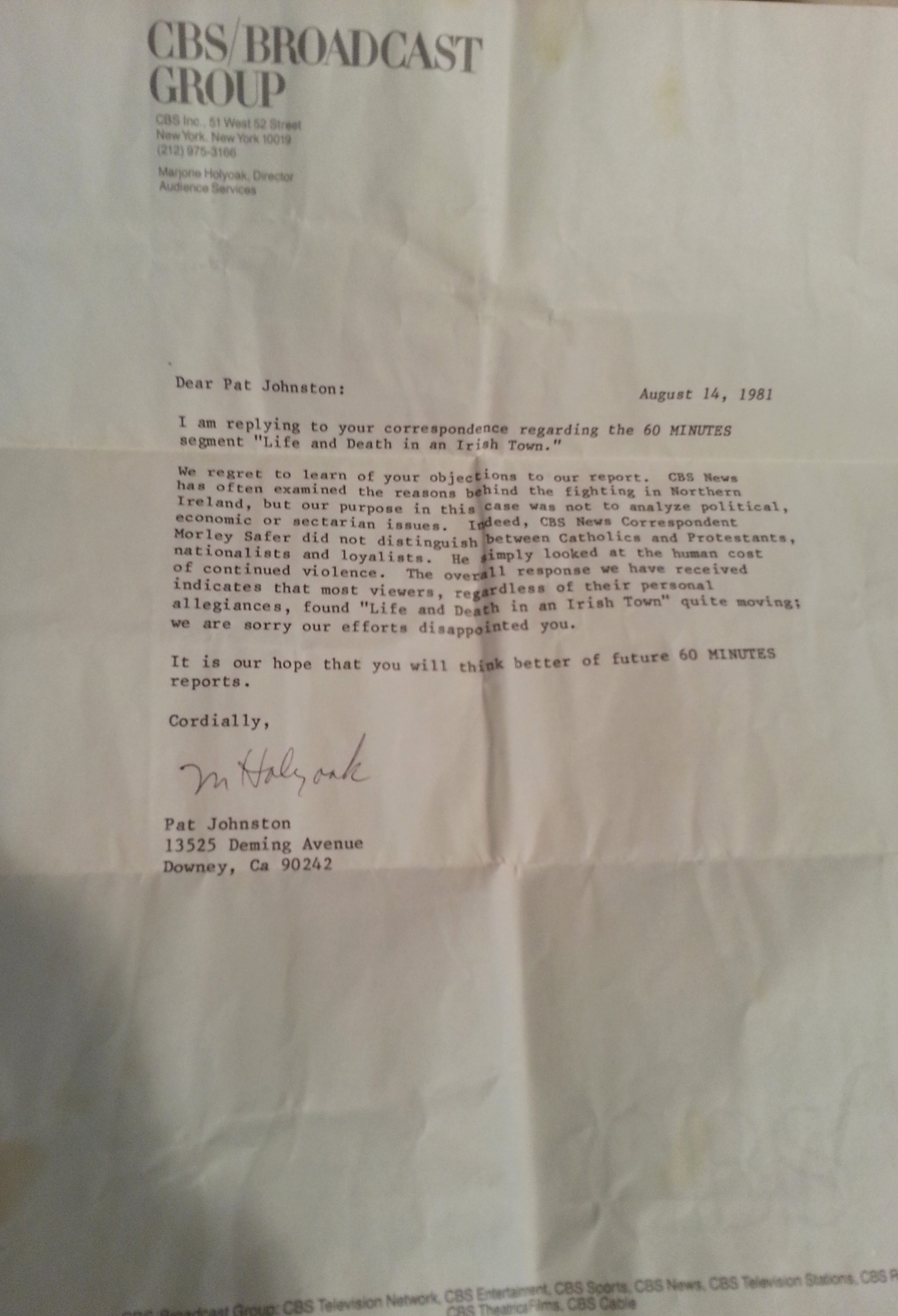 A copy of the response Dad received from CBS following his letter criticizing a segment about Northern Ireland.