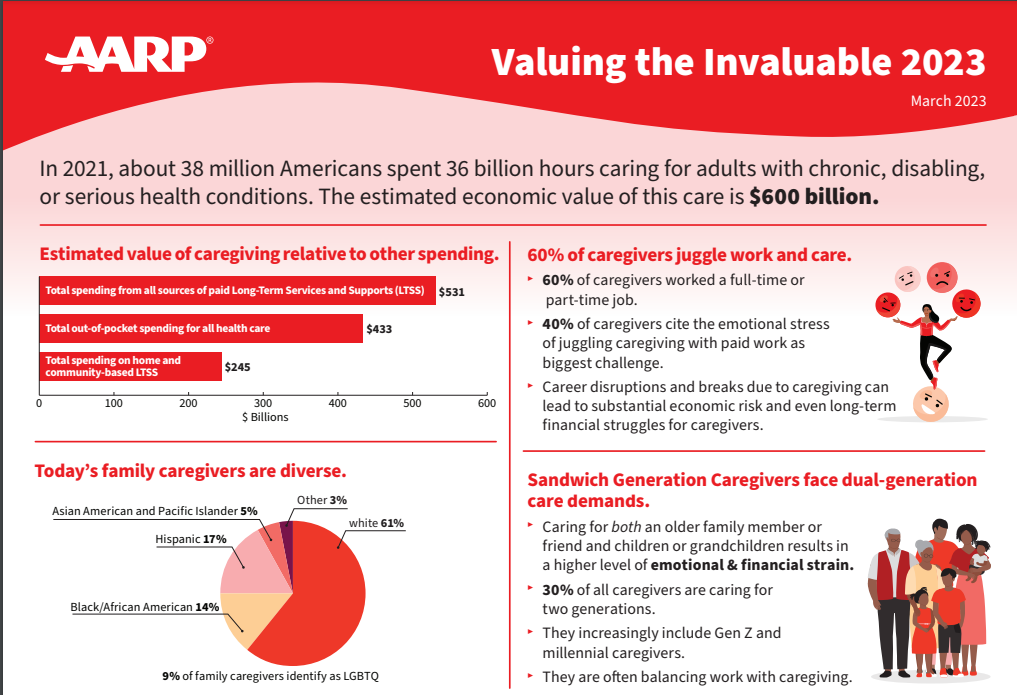 This month, AARP released a report: Valuing the Invaluable 2023 Update. While no one has to tell caregivers how much free labor they provide while caring for their loved ones, it does help to calculate a value for caregiving work and have a well-known organization like AARP broadcast how much economic value caregivers provide.